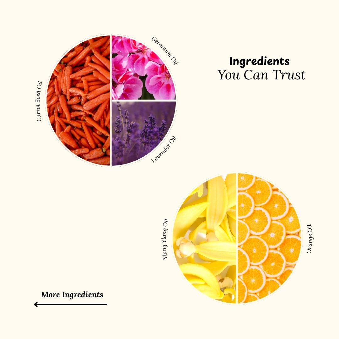 - Essential Oils: Jasmine, Carrot Seed, Geranium, Lavender, Ylang Ylang & Orange