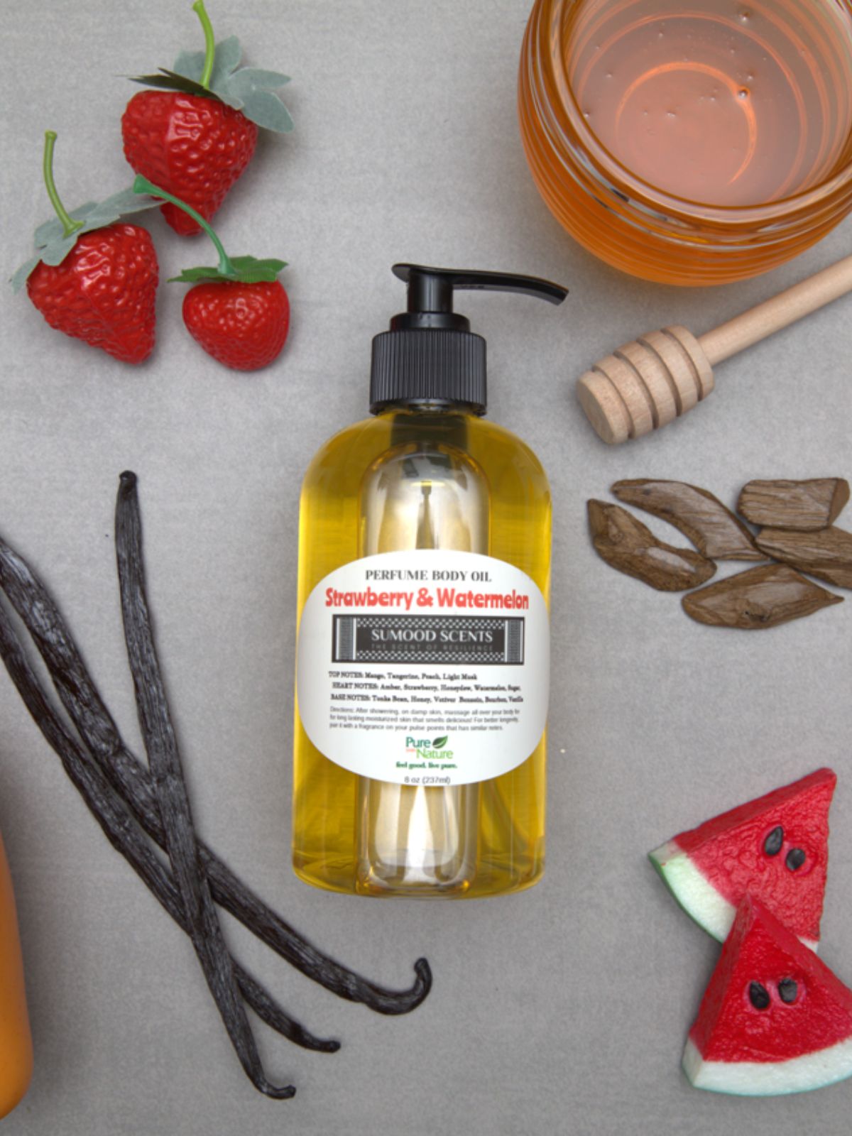 Dive into summer with our Strawberry & Watermelon Moisturizing Body Oil. This amazing hydrating body oil makes your skin feel nice and smell great, just like a bowl of fresh fruit. It gives your skin lots of moisture and a lovely, bright look. It's also a long lasting sweet scented body oil, so you'll smell wonderful all day.