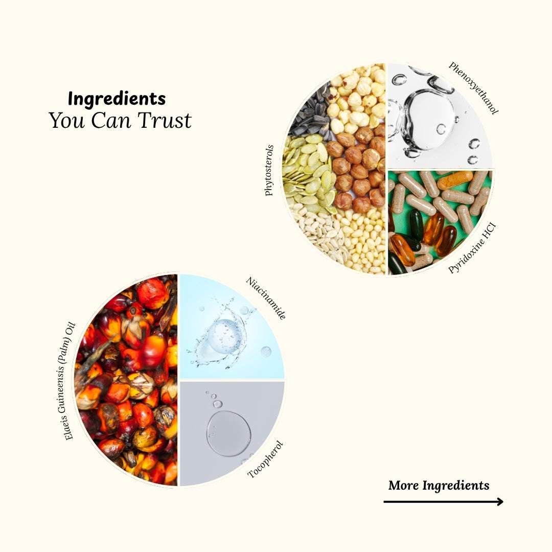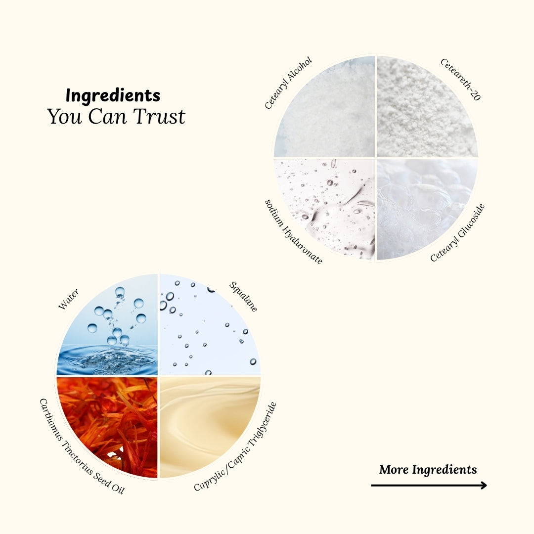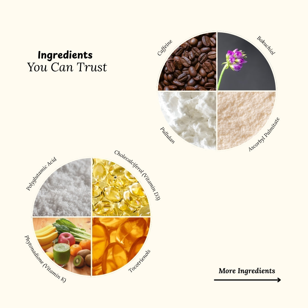 Water, Carthamus Tinctorius (Safflower) Seed Oil, Caprylic/Capric Triglyceride, Squalane, Cetearyl Alcohol, Cetearyl Glucoside, Ceteareth-20, Sodium Hyaluronate, Polyglutamic Acid, Caffeine, Bakuchiol, Pullulan, Ascorbyl Palmitate, Cholecalciferol (Vitamin D3), Phytonadione (Vitamin K), Tocotrienols, Elaeis Guineensis (Palm) Oil, Tocopherol, Squalene, Phytosterols, Niacinamide, Pyridoxine HCI, Phenoxyethanol, Caprylyl Glycol, Sorbic Acid.